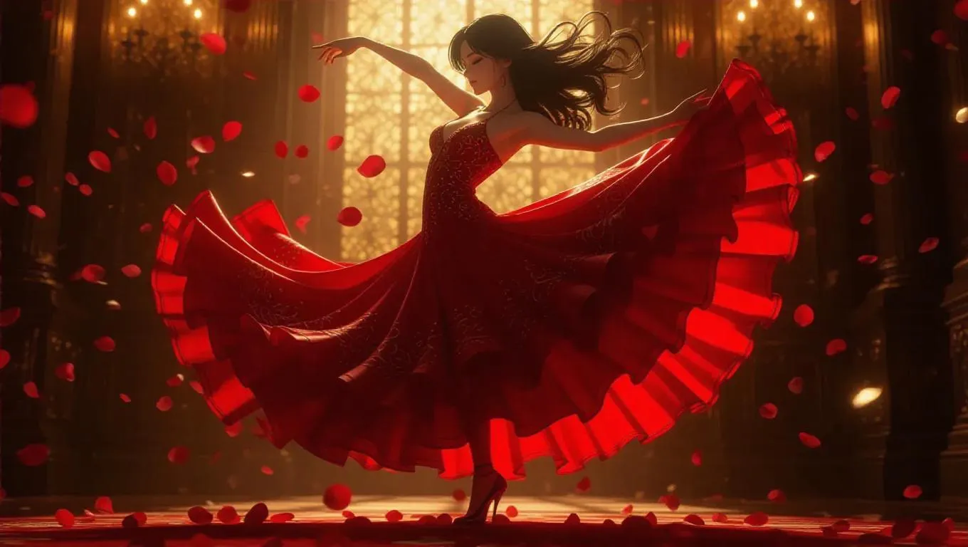 A sultry anime dancer in a red flamenco dress with intricate patterns is frozen mid-spin, her body elegantly arched. Rose petals swirl around her, illuminated by soft gold lights that cast soft highlights on her flowing dress and create dramatic shadows. The background is a luxurious mansion, emphasizing her dynamic pose and the fluid motion of her dance.