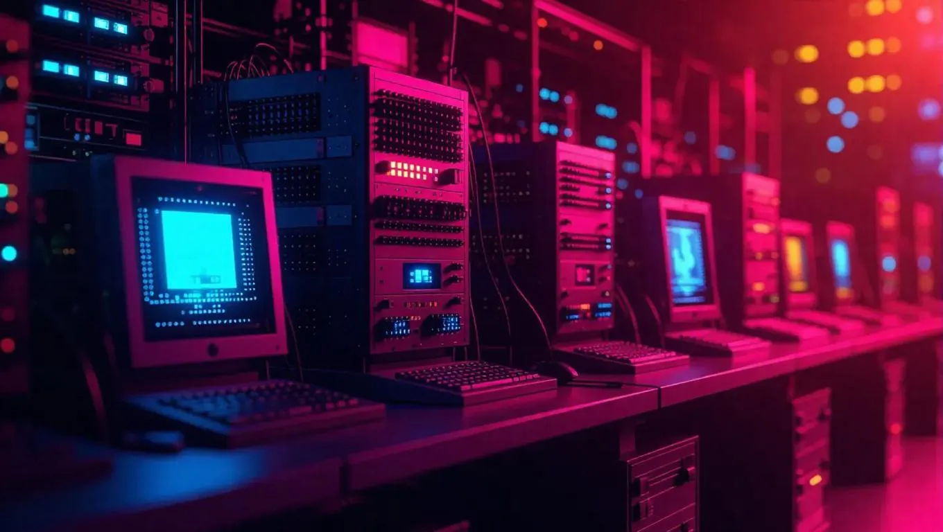 Explore the evolution of computers from bulky mainframes to sleek AI-powered devices in this futuristic illustration. A dynamic timeline transitions vintage machines to modern smartphones, blending retro and modern aesthetics with a cool tech palette. Highlighting digital transformation and AI integration, this visionary design captures technological advancement through detailed contrasts and dynamic lighting.