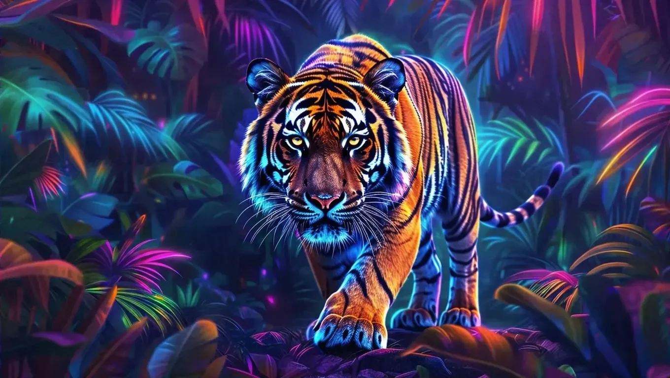 Generate a vibrant AI-powered tiger image glowing with dynamic RGB lighting effects. Transform text prompts into striking visuals using vivago.ai's advanced tools for surreal, neon-lit wildlife art and professional-grade creative enhancements.