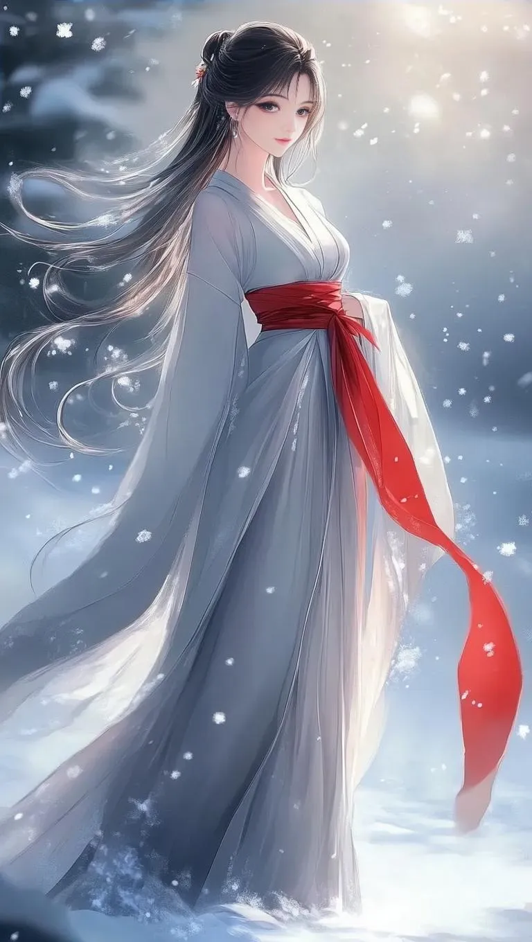 Create a serene anime-style scene featuring a graceful female figure in soft gray and white attire, highlighted by a vibrant red sash. Set in a snowy landscape with falling snowflakes, this ethereal atmosphere evokes tranquility and beauty. Perfect for AI-generated art and anime enthusiasts.