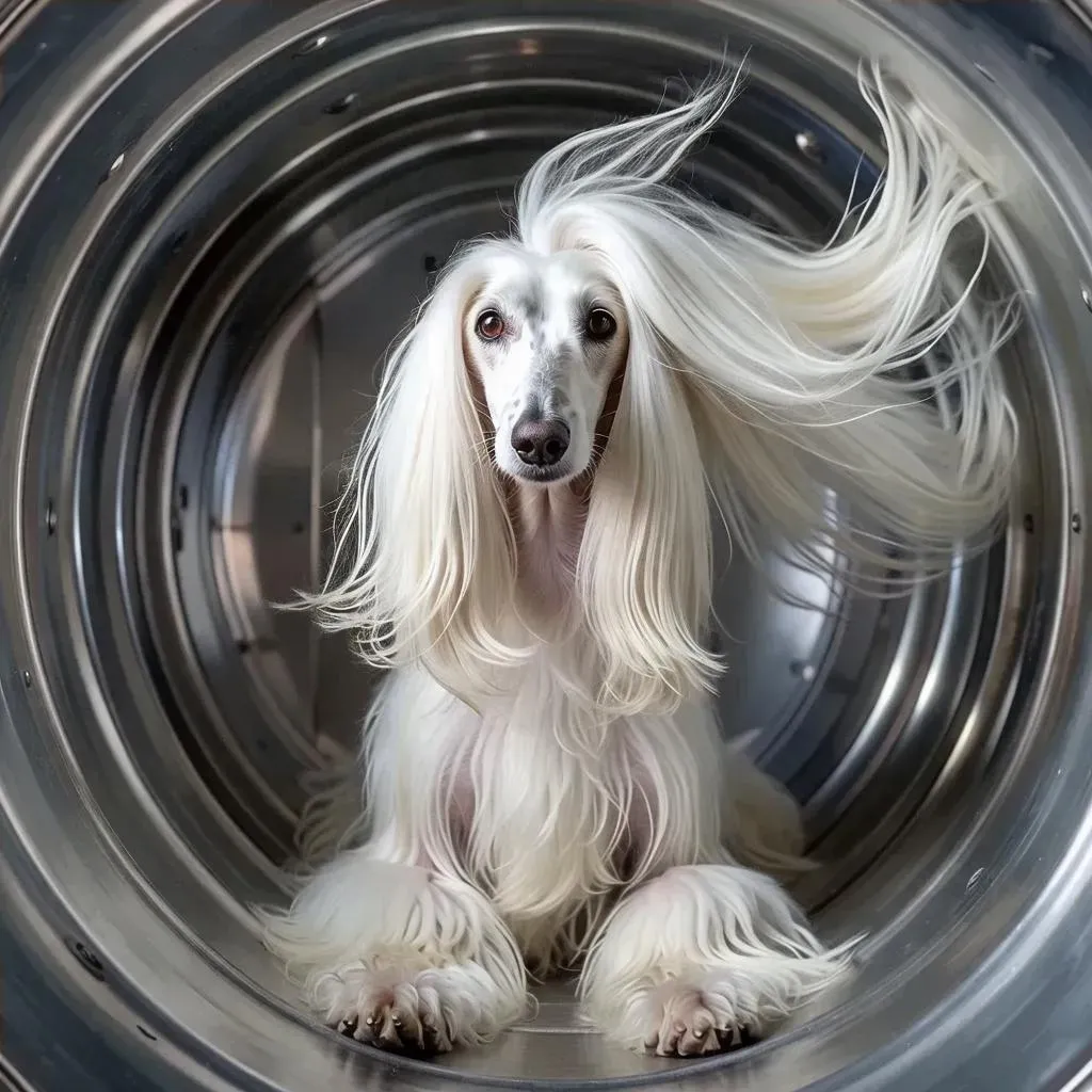 Generate a stunning AI image of a white Afghan hound in a wind tunnel, featuring dramatic floating hair spread out dynamically. Explore AI effects like Big Hair and Long Hair to enhance motion realism. Create high-quality visuals with vivago.ai's creative tools for lifelike, windswept animal portraits.