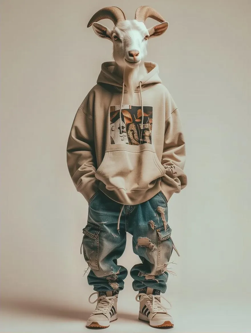 Discover hyperrealistic anthropomorphic goat art. Generate AI images of a streetwear-clad goat standing humanoid against neutral backgrounds. Create full-body studio portrait shots with vivago.ai's advanced AI image generation. Perfect for modern anthropomorphism in visual content creation, offering high-quality creature design and fantasy character visualization.