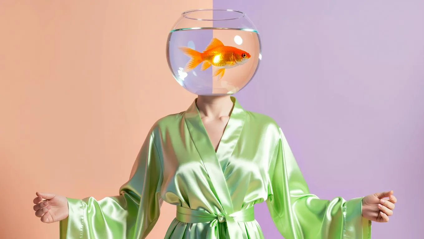 Create surreal AI images of figures with glass fishbowl heads and glowing floating goldfish. Features lime-green satin robes with iridescent reflections against soft peach and lilac dreamlike backgrounds. Realistic lighting enhances depth. Generate high-definition ethereal art via vivago.ai's AI photo tools.