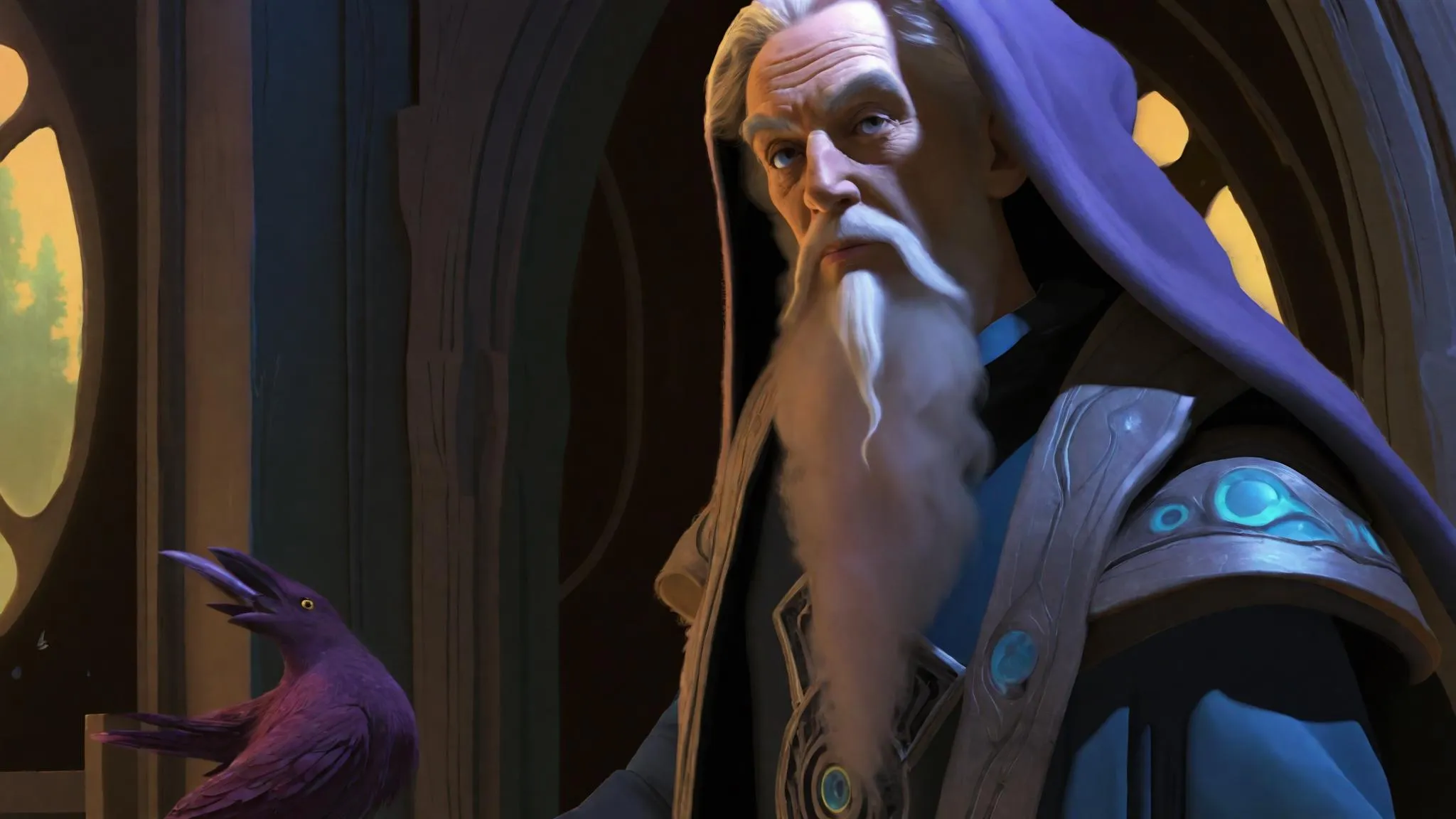 Generate mystical AI art featuring an ancient wizard with glowing violet eyes, a constellation-shifting cloak, and spirit wolves emerging from mist. Capture arcane atmosphere with pulsating rune staff, aurora-lit ruins, bioluminescent mushrooms, and dramatic low-angle 35mm lens perspective. Perfect for supernatural fantasy visuals and ethereal magical scene creation.