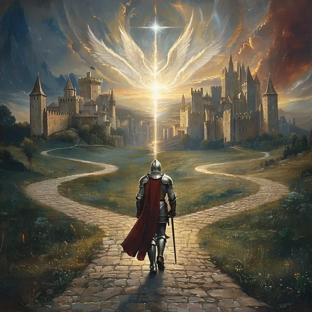 Experience AI-generated visuals of a Christian knight at a crossroads, torn between heaven's radiant path and hell's fiery descent. Vivago.ai transforms text prompts into striking art, blending spiritual symbolism with dramatic AI effects for immersive storytelling and moral reflection.