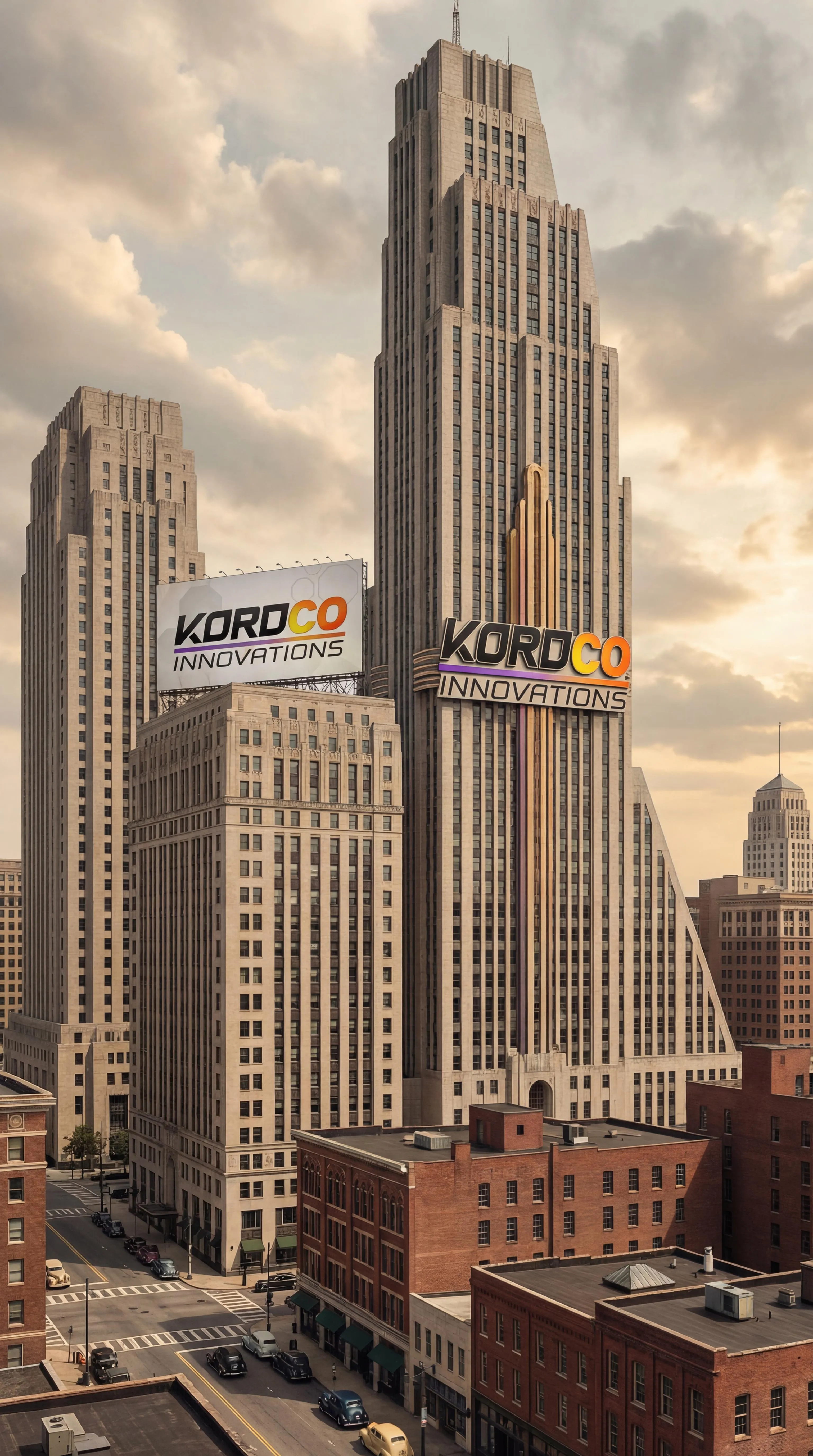 Transform text into AI-generated concept art: See the retrofitted Kord Tower from Blue Beetle (DCEU) featuring the Kordco Innovations logo in 1940s Metro Atlanta. The adjacent building displays a Kordco banner, while the neighboring LexCorp structure stands blank. Create unique cinematic scenes with vivago.ai.