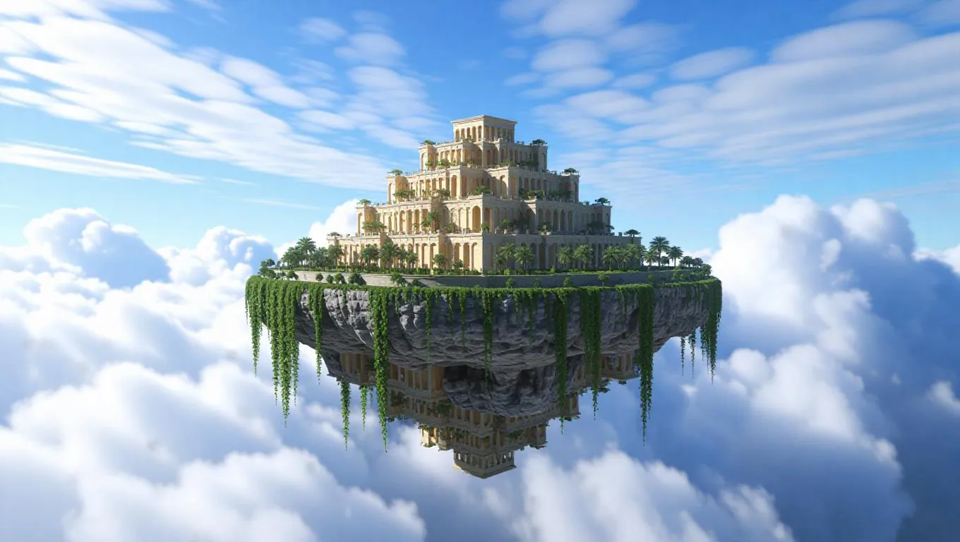 Transform text into breathtaking visuals with AI. Generate the Hanging Gardens of Babylon floating on ethereal clouds against a vibrant azure sky, surrounded by misty cumulus formations. Experience mythical wonder through AI-powered surreal landscapes, blending ancient wonders with dreamlike skies for stunning digital art or video projects.