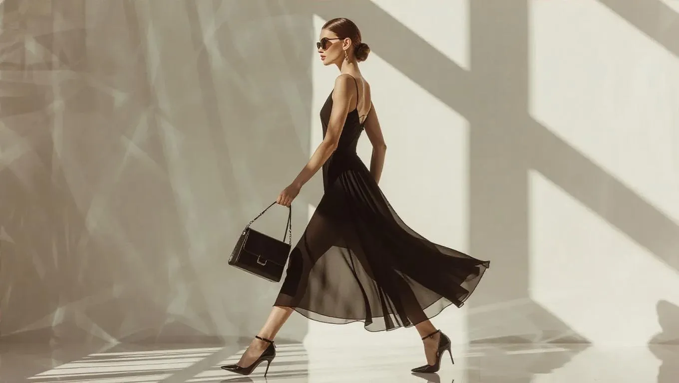 Create a stunning AI-generated image of a model in a chic party wear dress and stylish leather bag, walking confidently on a clean white background. Perfect for fashion inspiration, this long-view shot highlights vibrant details and professional-grade visuals, crafted with Vivago.ai's AI tools for dynamic, high-resolution content creation.