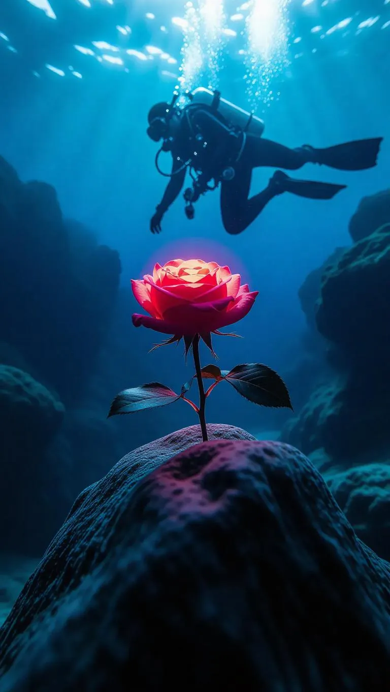 Transform text into ethereal AI visuals with vivago.ai. Generate magical underwater scenes: a diver discovering a glowing rose on a rock, bathed in soft dreamy focus. Craft professional-grade imagery with AI effects and editing tools for captivating, surreal creative projects.