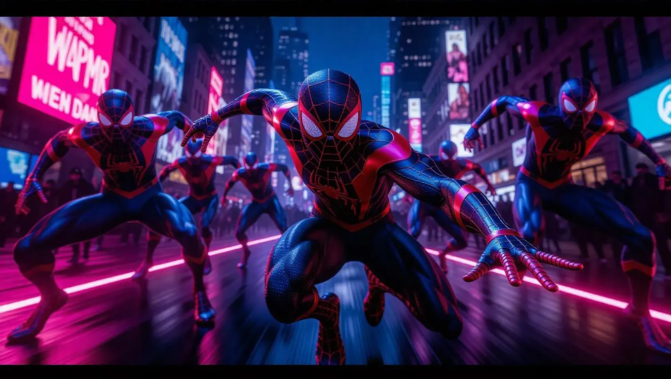 Create an action-packed scene featuring Miles Morales in his black Spider-Man suit, being chased by a multitude of Spider-Men from different dimensions. Each Spider-Man should embody a distinct art style, such as manga, comic book, graffiti, and watercolor, all within the same image. The setting is a futuristic New York City, with a blend of skyscrapers and neon lights. The perspective is a dynamic mid-shot, capturing the intensity of the chase. The lighting is dramatic, with shadows and highlights enhancing the sense of movement and speed. The composition follows the rule of thirds, adding depth and balance to the visual narrative.