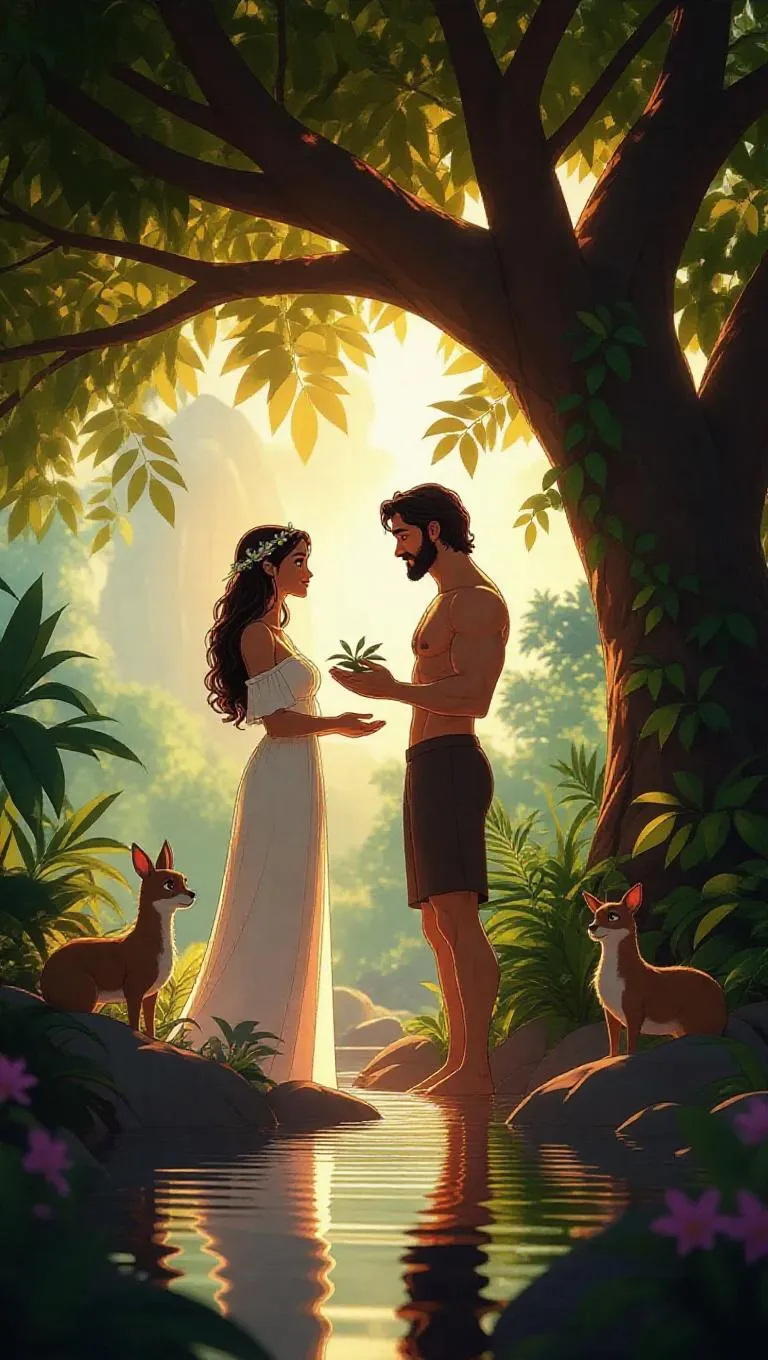 Create AI-generated comic art of Eve and Adam in Eden with vivago.ai. Transform text prompts into vibrant, humorous scenes using creative AI tools. Design dynamic visuals with bold colors and modern storytelling for professional-grade comic strips or illustrations. Explore AI image generation for fresh takes on classic tales.
