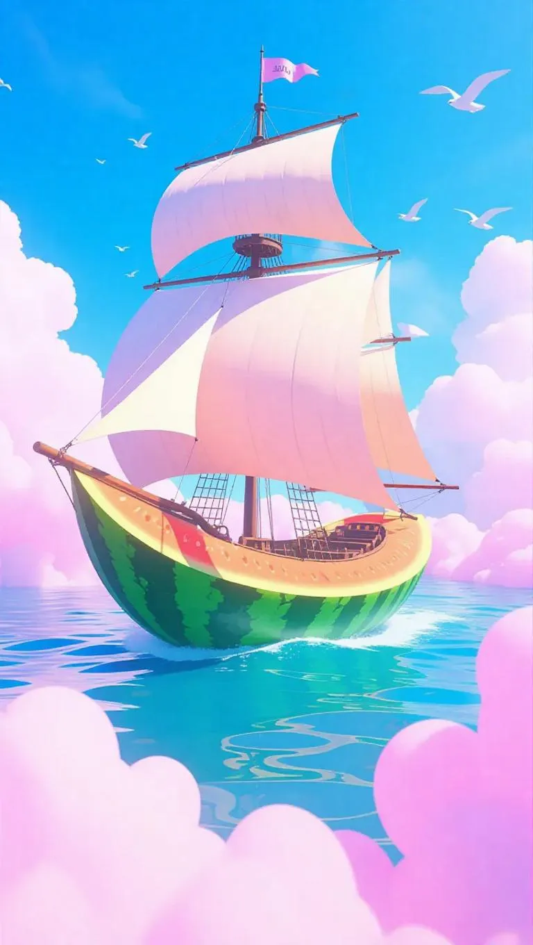 Skyships crafted from cantaloupe shells, propelled by fizzy soda mist, glide through ethereal pink clouds. Papaya silk sails catch the breeze, while below, carbonated kiwi bubbles ripple the seas. Sky pirates barter in rare, exotic seeds that sprout into new islands overnight, creating a whimsical, fantastical world.