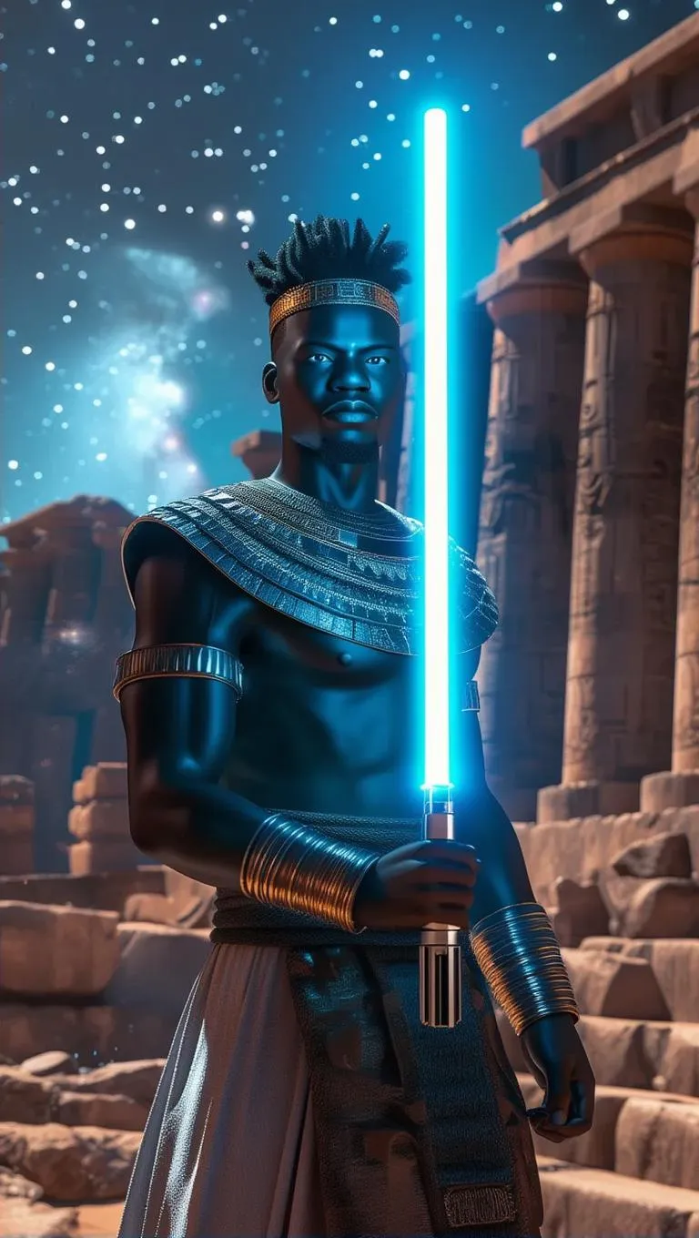 Generate hyper-realistic 3D African warrior art wielding a blue lightsaber with AI image tools. Craft cinematic sci-fi visuals blending cultural heritage and futuristic elements. Ideal for concept art, digital storytelling, or dynamic character design. Elevate projects with AI-generated 3D realism, vivid lighting, and professional-grade details for immersive sci-fi/fantasy scenes.