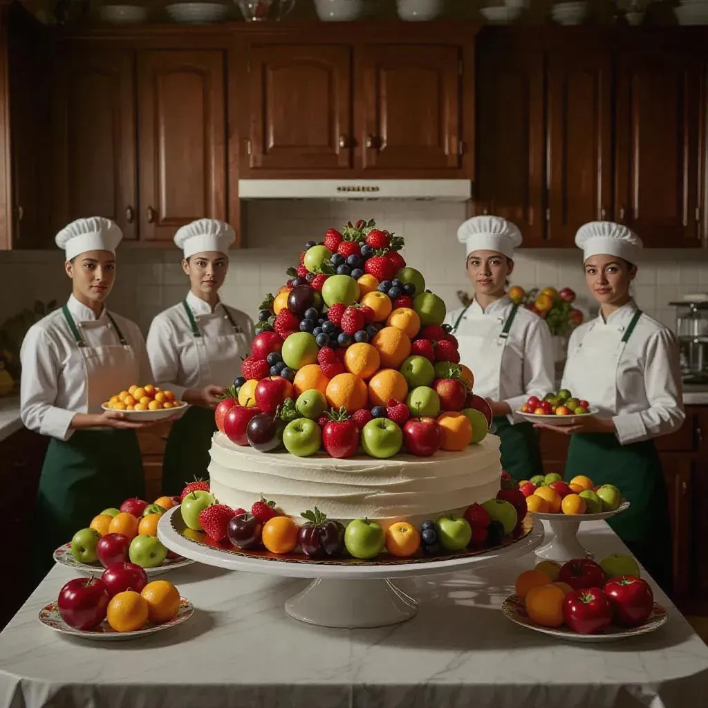Create a stunning AI-generated image of a vibrant fruit-and-vegetable cake in a vintage kitchen. Featuring uniformed workers, soft natural lighting, and symmetrical composition, this scene blends fresh ingredients with warm decor for a harmonious, professional baking aesthetic. Perfect for culinary artistry or inviting kitchen visuals.