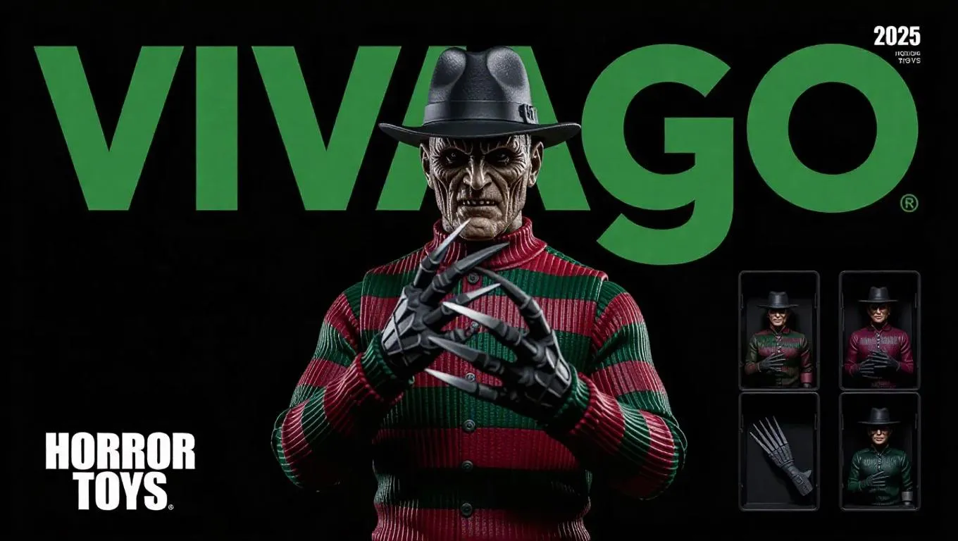 Premium collectible Freddie Krueger action figure with iconic bladed glove, rendered in photorealistic HD. Features serious expression, standing pose, and character-specific accessories in blister-pack compartments. Sleek black packaging highlights "VIVAGO Horror Toys" branding with green/white text and white "2025" label. Ideal for horror enthusiasts seeking high-def Nightmare on Elm Street memorabilia in premium toy collectible style.
