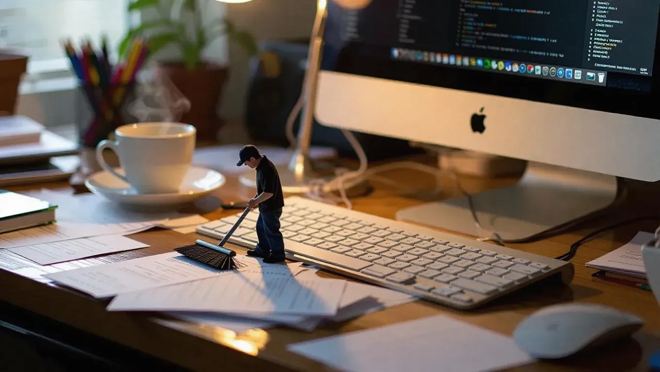 Generate a whimsical AI scene of a miniature janitor sweeping a life-sized Mac keyboard on a messy desk. Explore VivaGo's AI image tools for quirky workspace visuals, transforming text prompts into playful, detailed imagery. Perfect for creators seeking unique AI-generated office humor and professional-grade editing effects.