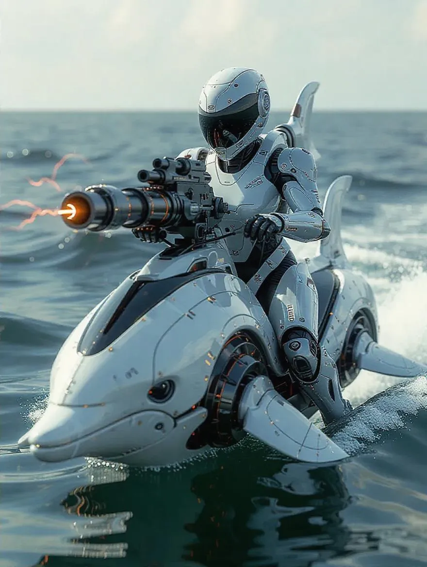 Explore AI-generated sci-fi art of a solo female soldier riding futuristic machinery, wielding a bio-mechanical rail-gun emitting electric pulses. Features a spiral dolphin-edge craft with shimmering liquid metal textures against a sci-fi ocean backdrop. Perfect for AI-driven designs blending metallic surfaces, intricate biomechanics, and dynamic energy effects in realistic futuristic exploration themes.