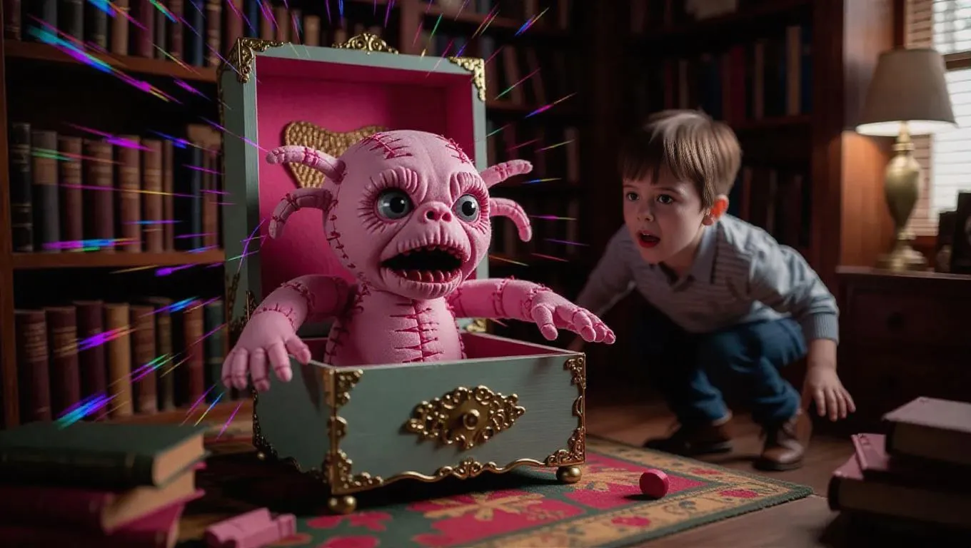 The music box opens fully — inside: a fleshy, malformed plush creature (Cosita), stitched unevenly, with shiny button eyes and too many fingers. It twitches to the beat. The boy steps back in horror. Room distorts slightly, books fall from shelves. Scene vibrates with glitched VHS tracking. --ar 4:5 --style raw --flesh-toy hybrid --glitch FX --pastel horror Стиль: horror toycore, VHS glitch, pastel decay, Coraline meets Silent Hill, cinematic lighting, analog textures--ar 16:9 --style raw --v 5.2 --vhs texture --glow effect --cinematic light