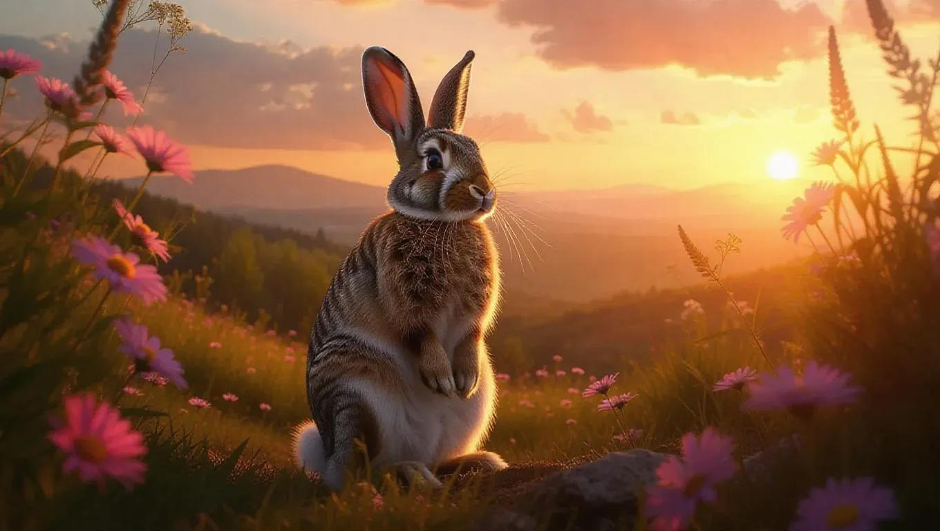 Create a stunning AI-generated masterpiece of a majestic Easter bunny in an epic landscape. Vibrant foliage, dramatic sunset, and serene meadow with delicate blossoms enhance the awe-inspiring scene. Perfect for professional visuals using Vivago.ai's AI image tools for lifelike details and artistic effects.