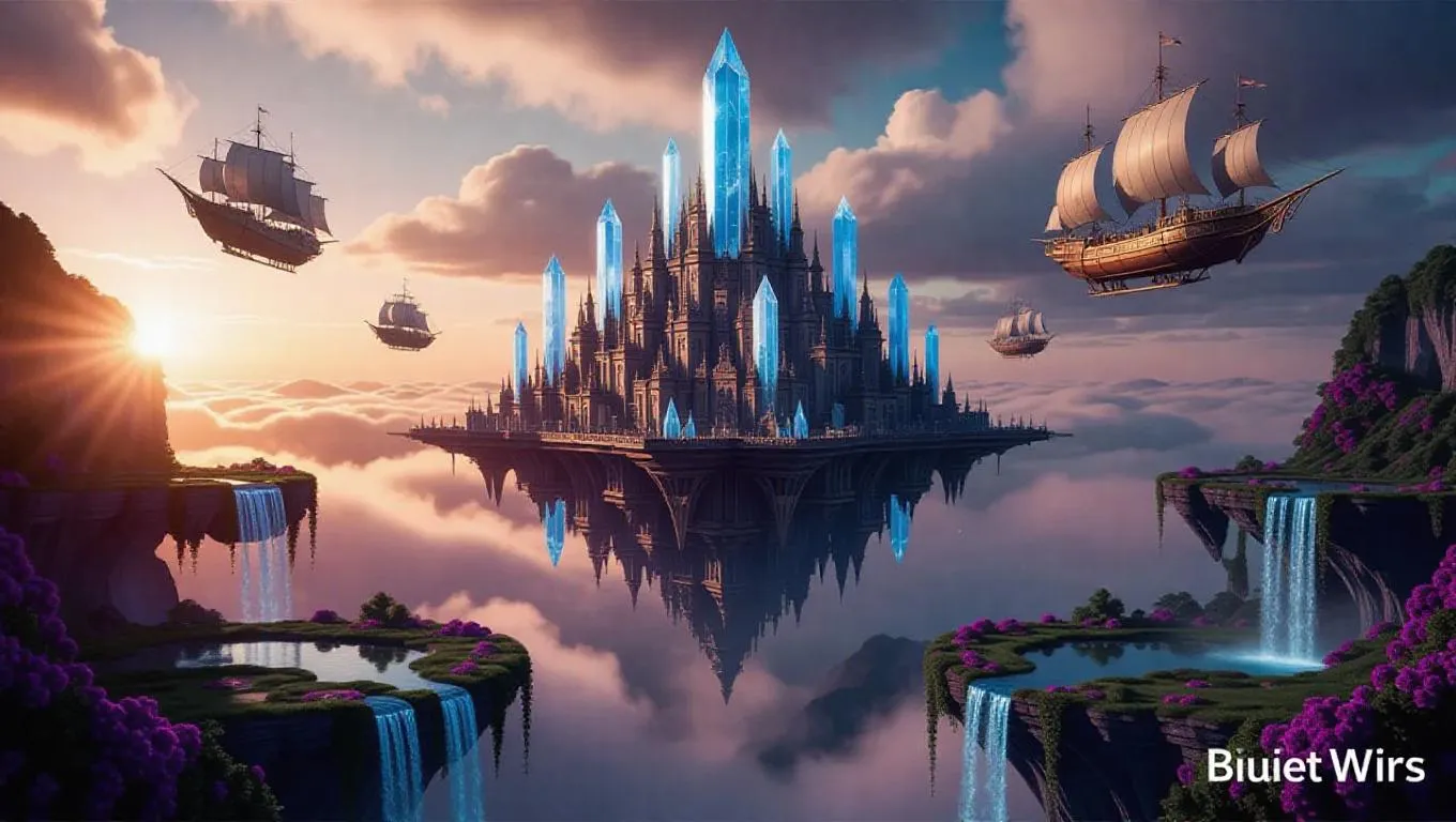 A breathtaking, hyper-detailed fantasy world above the clouds, where a colossal floating metropolis dominates the sky—towering crystal spires gleaming under a golden sunrise, adorned with intricate arcane runes. Lush floating gardens overflow with vibrant bioluminescent flora, while glowing cerulean waterfalls cascade into the misty abyss below. Majestic airships with ornate brass fittings soar gracefully among the clouds, their sails catching the dawn light. Swirling mist, dynamic shadows, dreamy yet hyper-realistic atmosphere. Ultra-wide cinematic composition, 8K resolution, photorealistic textures, intricate steampunk-fantasy fusion, inspired by legendary concept artists like Simon Stålenhag and Moebius. --ar 16:9 --v 6 --style raw --chaos 20 --stylize 700