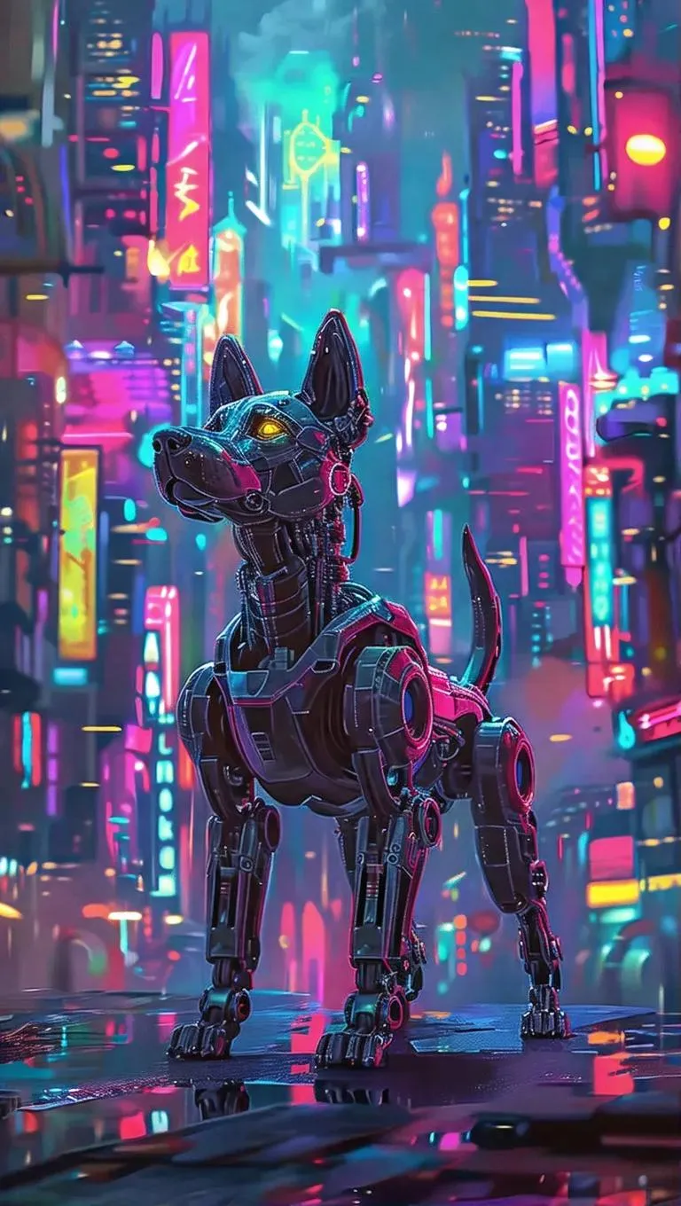 Transform text into cyberpunk AI art with VivaGo's cinematic oil painting effects. Generate a futuristic robot dog in 3D rendering, blending dystopian aesthetics with classic artistry. Elevate your visuals using advanced AI tools for professional-grade, imaginative results.