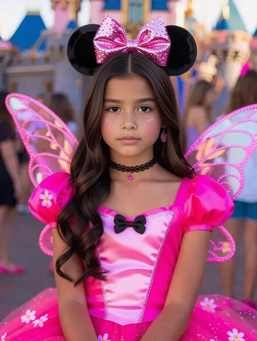 Create adorable Disney princess transformation AI art: Latino boy as Latina girl in hot pink Minnie dress with fairy wings, glitter details, wig, and makeup. Capture nervous, embarrassed cuteness at a Mother-Daughter Disneyland day full of girls. Generate this magical character concept.
