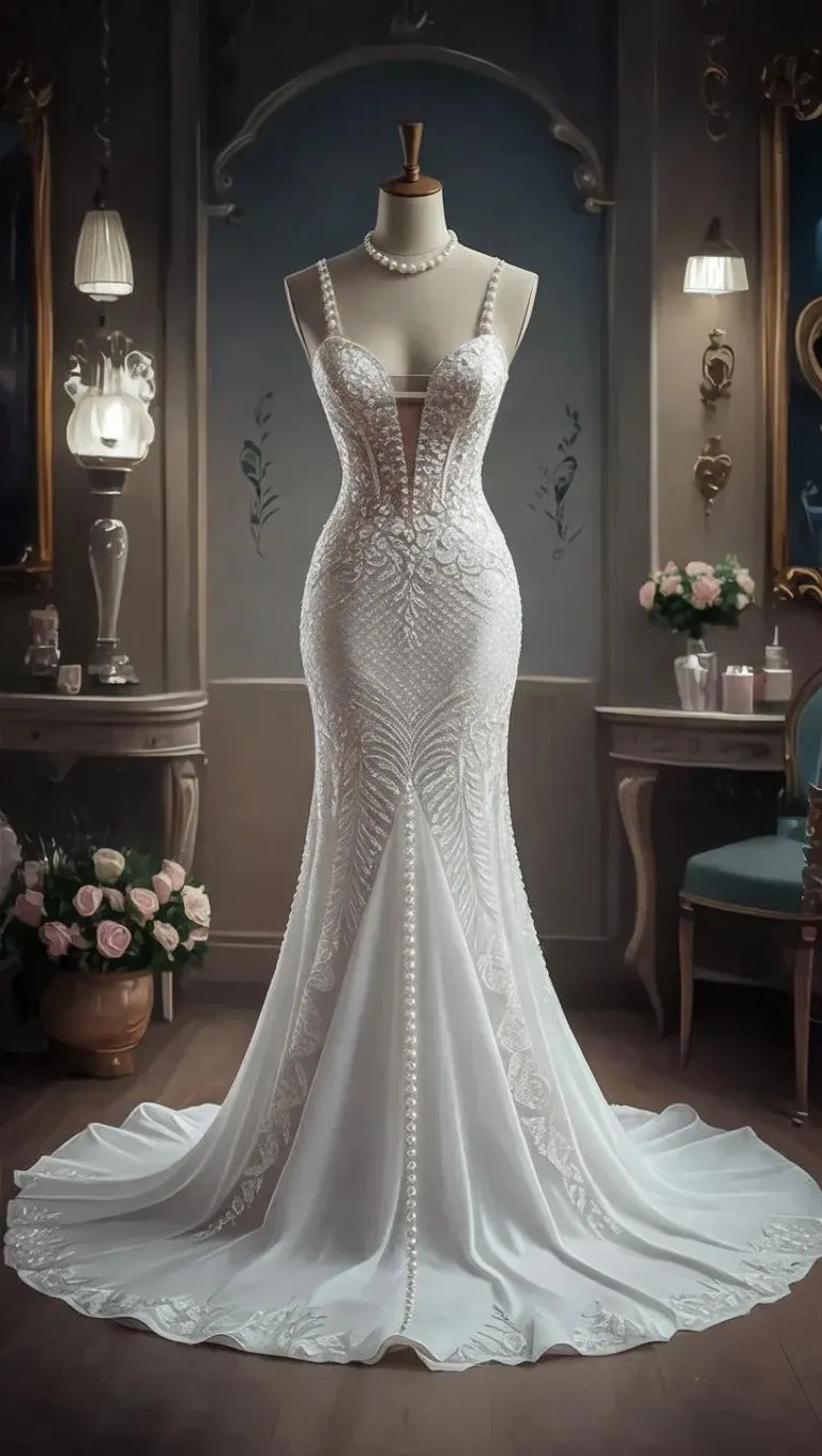 Discover elegant AI-generated wedding dress designs featuring a mermaid tail silhouette, white pearl neckline, and thick straps. Perfect for brides seeking timeless elegance with a long train. Explore custom sketches on a mannequin, crafted by vivago.ai's advanced creative tools for modern bridal fashion.