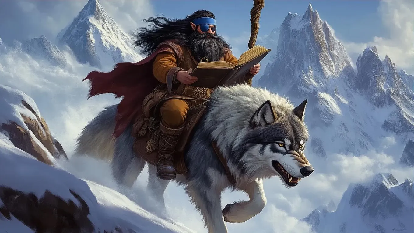 Generate an AI-powered fantasy scene of a D&D dwarf wizard with an eyepatch, long dark hair, and beard riding a dire wolf, clutching a staff and spellbook. Snow-capped mountain backdrop enhances this epic scenery shot. Perfect for RPG storytelling or AI-generated character art using Vivago.ai's creative tools.