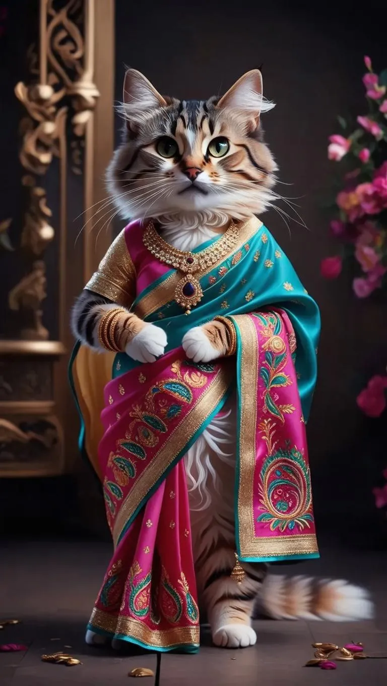 Create AI-generated whimsical cat photoshoots with vivago.ai. Craft playful cats in vibrant Indian sarees adorned with traditional jewels, intricate paisley motifs, and floral patterns. Blend elegance and cuteness as poised feline models strike charming poses. Perfect for creative AI art, text-to-image prompts, or enhancing visuals with AI effect tools.