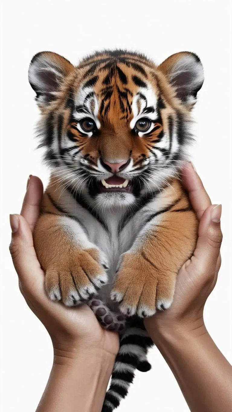 Create a heartwarming AI-generated image of a tiny baby tiger curled in a human palm, emphasizing its miniature size and playful charm. Highlight the tender connection with wide-eyed curiosity, a sweet grin, and protective hand symbolism. Perfect for showcasing AI-powered detail in crafting adorable, focus-driven animal-human bond visuals. Ideal for emotive storytelling or whimsical content creation.