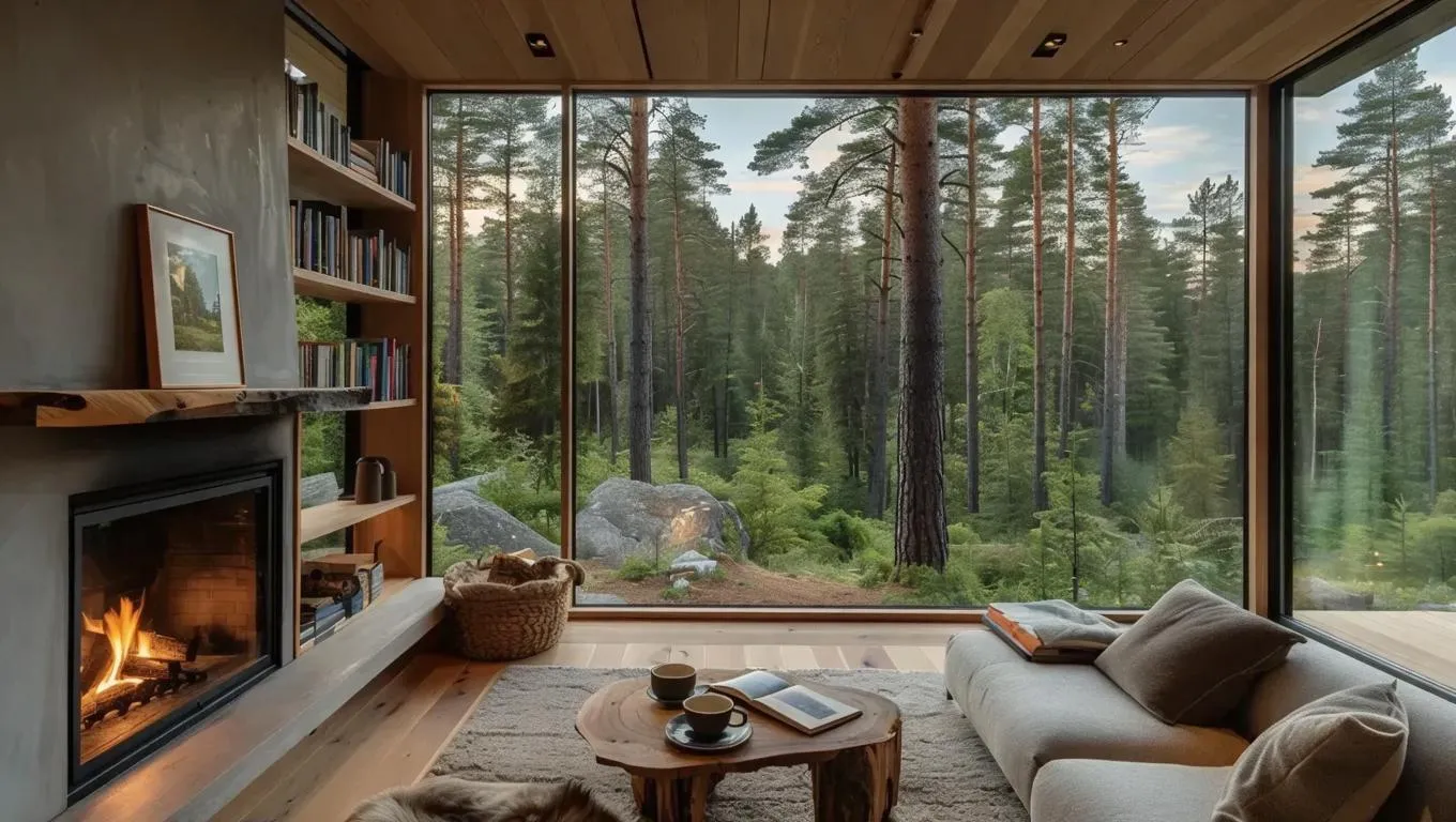 Experience a nature-integrated home where modern windows frame serene landscapes, blending indoor comfort with outdoor beauty. Relax by the fireplace, savor tea in a cozy reading nook, and immerse in seamless indoor-outdoor living. Every corner transforms into a tranquil retreat, merging design and nature for a harmonious, enchanting escape. Discover your serene haven with AI-crafted visual perfection.
