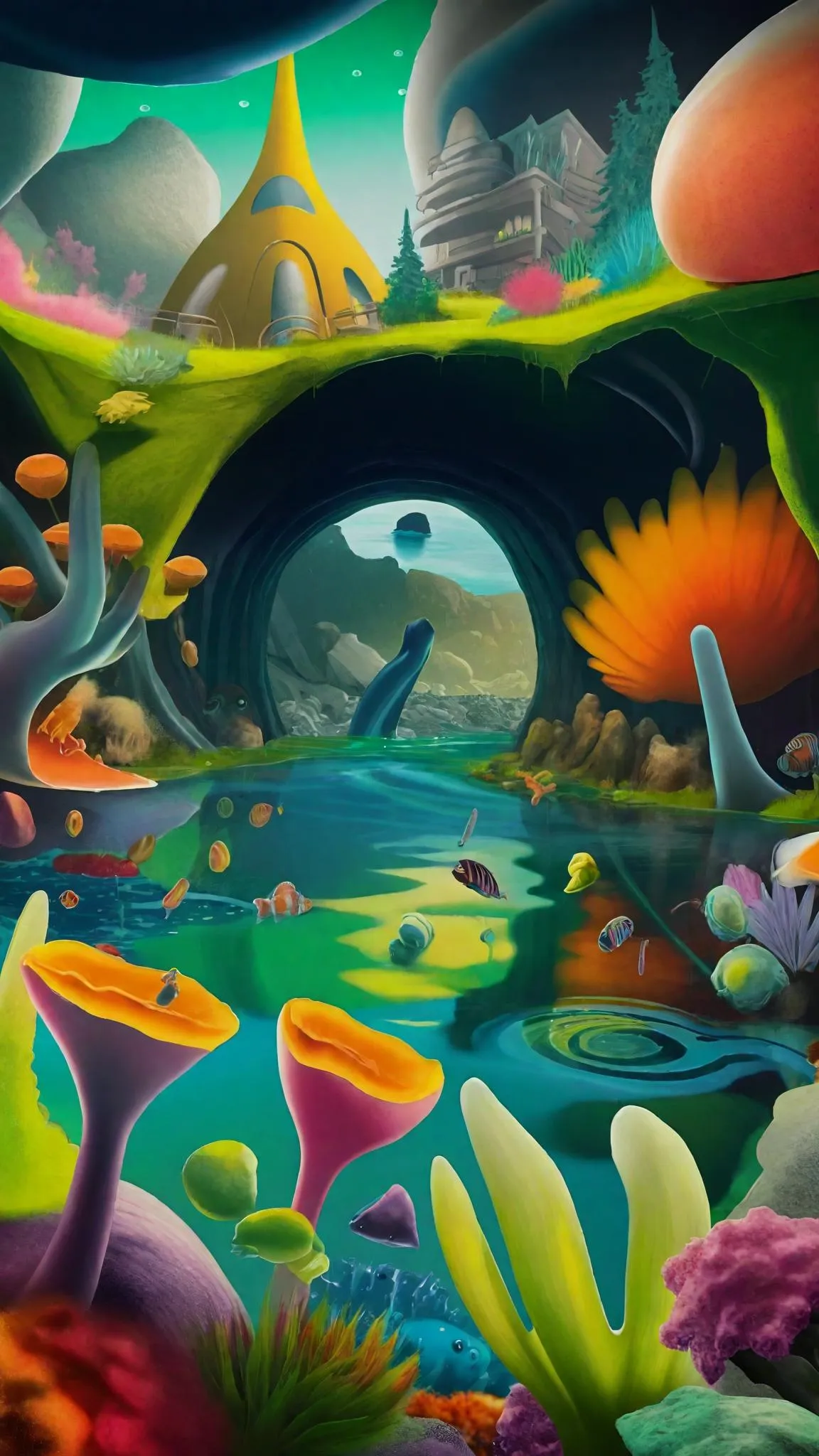 Dive into an AI-generated Cretaceous underwater cityscape with a submerged camera view. Clear blue-green waters reveal psychedelic Eric Carle creatures roaming natural rocks and coral reefs. Explore surreal underworld scenes, lunar landscapes, and meadows with our AI effects for stunning aquatic visuals. Perfect for underwater photography and creative waterpark-themed projects.