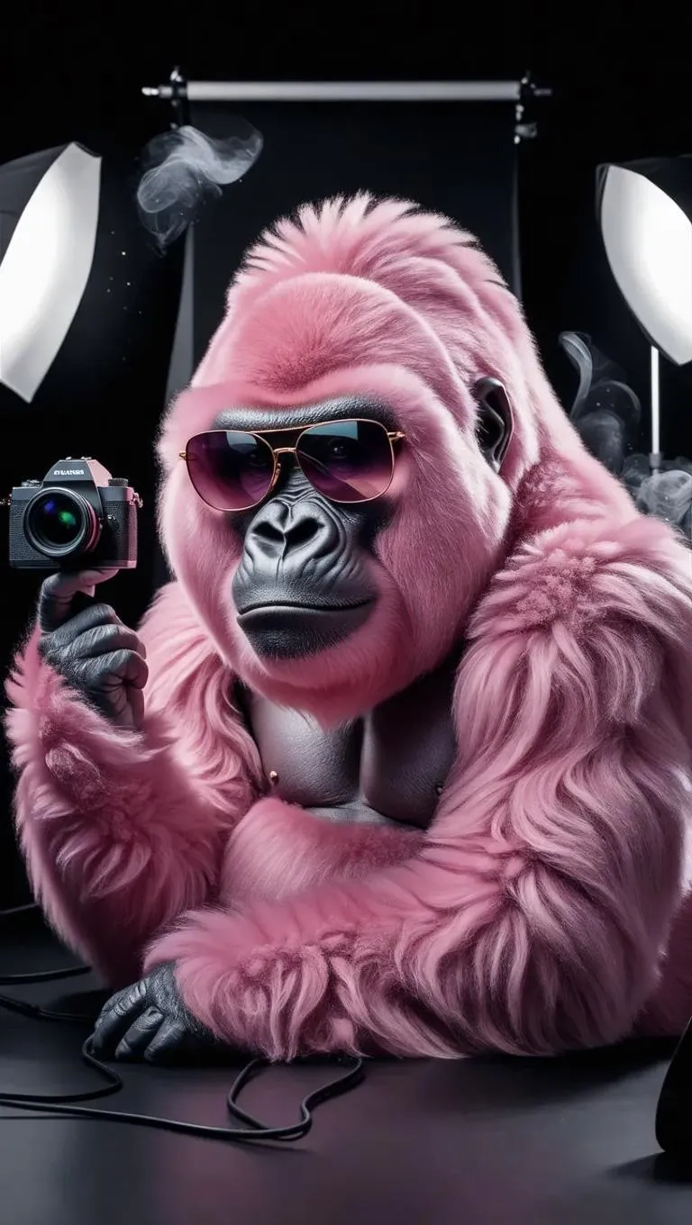 Capture a surreal fantasy fashion photoshoot with a fluffy pink gorilla in sunglasses. Studio shot on black background, soft lighting, magical tone. Full-body left-side camera angle. Create professional AI-generated visuals with vivago.ai's advanced tools for stunning, imaginative content.