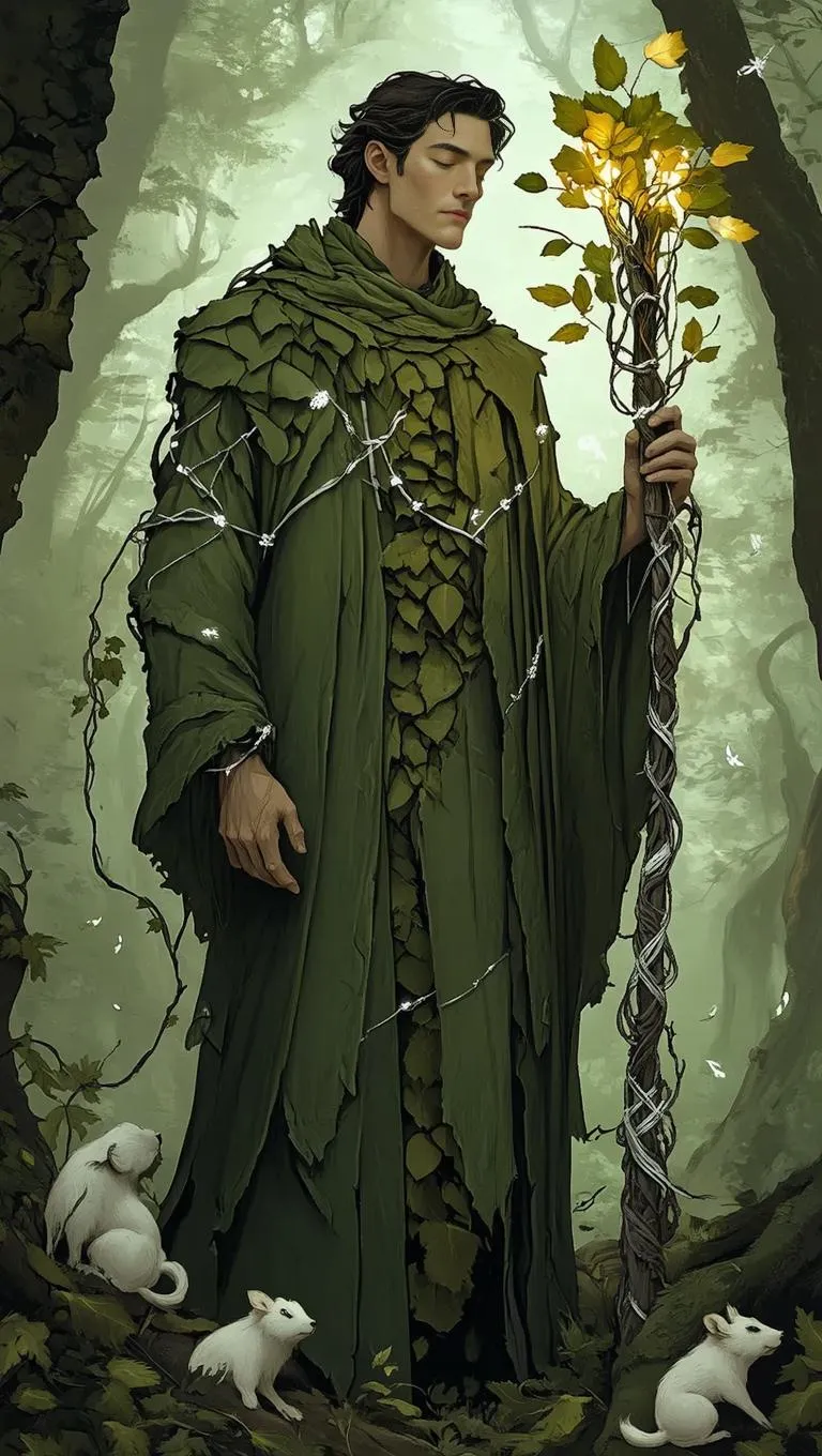 AI-generated fantasy illustration of an ancient forest guardian in a stitched book-page robe, glowing staff entwined with silver strings. Memory-animals whisper in parchment-toned woods. Gentle mystical vibe for storytelling, RPGs, and worldbuilding. Create enchanted characters with Vivgo.ai's AI art tools.