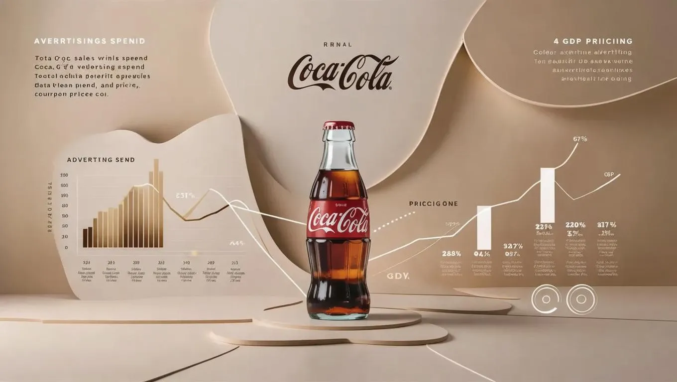 Generate a professional AI infographic analyzing Coca-Cola’s sales trends, advertising expenditure, pricing strategies, and GDP correlations. Features minimalist data visualizations in warm cream-beige tones with clear textual insights for impactful business intelligence. Ideal for marketing and economic analysis with elegant, understated design.