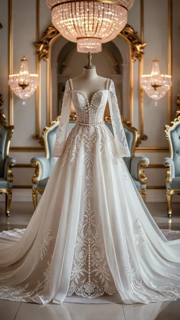 AI-Generated Royal Wedding Dress Designs blending chiffon, lace & pearls. Create luxurious, regal bridal gowns with ethereal details using advanced AI tools for timeless elegance & professional-grade results.