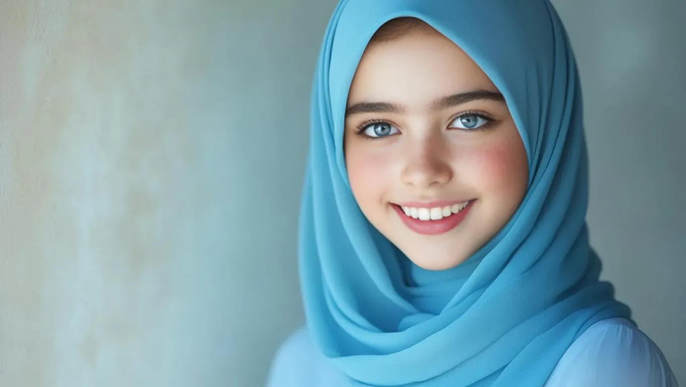 AI-generated half-body portrait of a radiant teenage girl in an elegant sky-blue hijab, showcasing captivating blue eyes, a warm smile, and flawless complexion. Perfectly lit, front-facing composition ideal for professional avatars or storytelling. Emphasizes natural beauty, modest attire, and balanced focus with a soft, plain background. Create stunning AI visuals for personal or narrative use with precision and artistry.