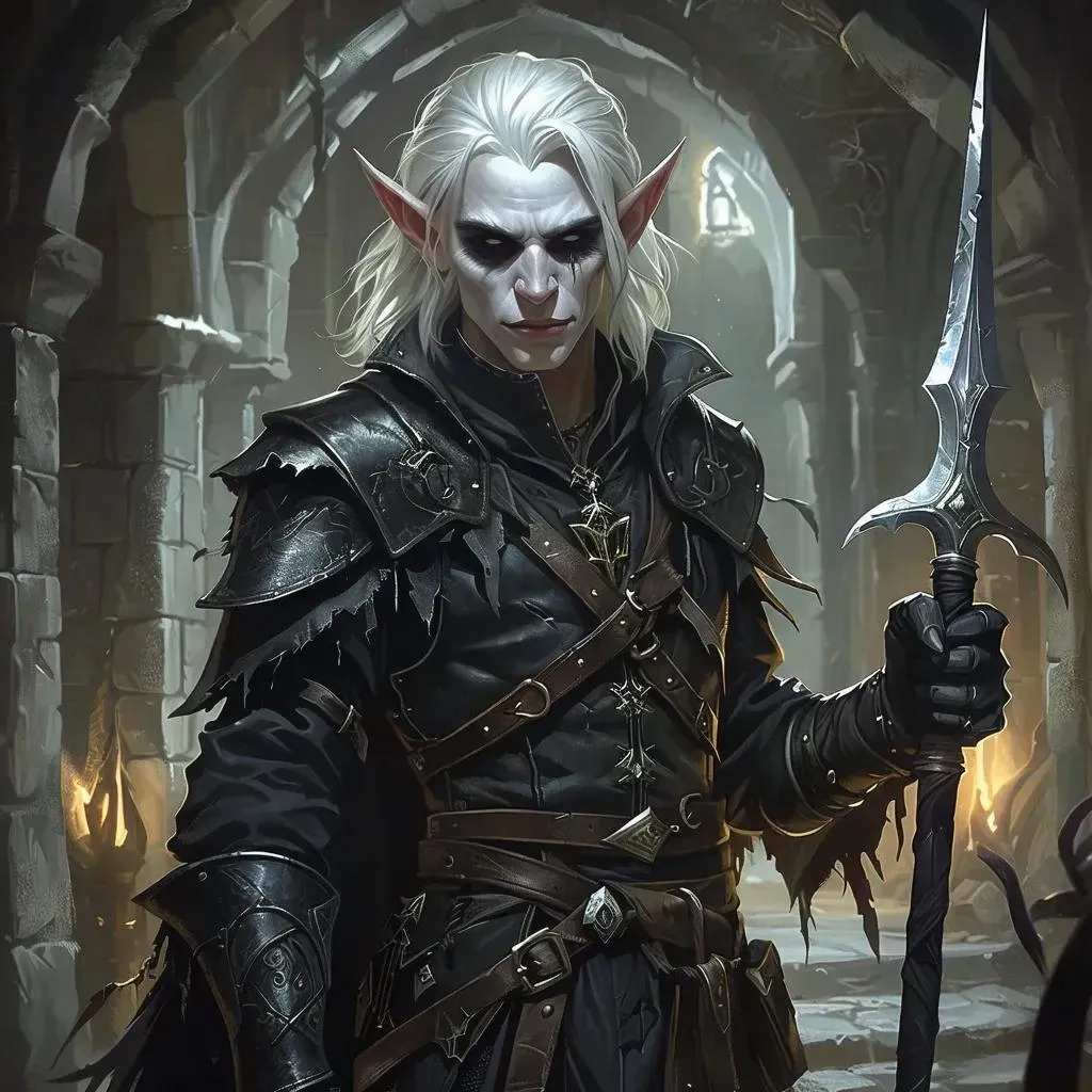 Create a haunting D&D Half-Elf Necromancer character with AI: pale skin, white hair, hollow black eyes, tattered leather armor, dual daggers, and sinister black aura. Summon a loyal imp companion, craft eerie details, and evoke dark fantasy vibes for tabletop RPG art. Perfect for AI-generated villains, spellcasters, or cursed adventurers in Dungeons & Dragons campaigns.