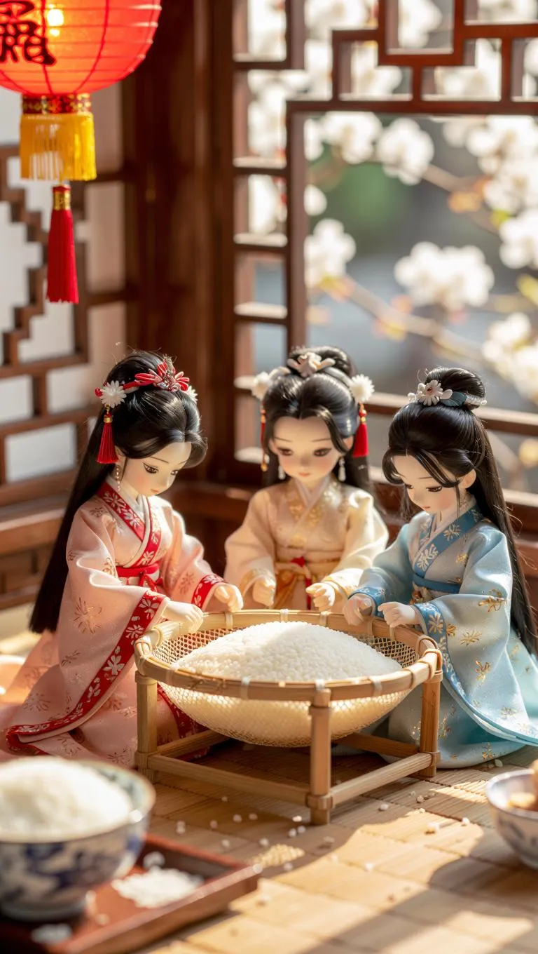 AI-generated miniature scene of Hanfu-clad dolls selecting glutinous rice on a bamboo sieve in a Dragon Boat Festival courtyard. Features macro photography details, natural lighting, and soft pastel tones. Experience AI-powered traditional festival visuals with exquisite craftsmanship and cultural storytelling through Vivago.ai's creative tools.