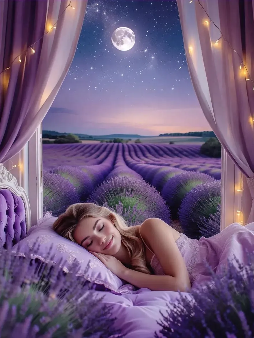 Generate enchanting AI visuals with VivaGO: a serene, magical room in purple-pink hues, a peacefully sleeping woman, and a lavender field outside. Craft healing, dreamlike scenes blending tranquility and fantasy through AI artistry, evoking emotional relief and serene beauty in every detail.