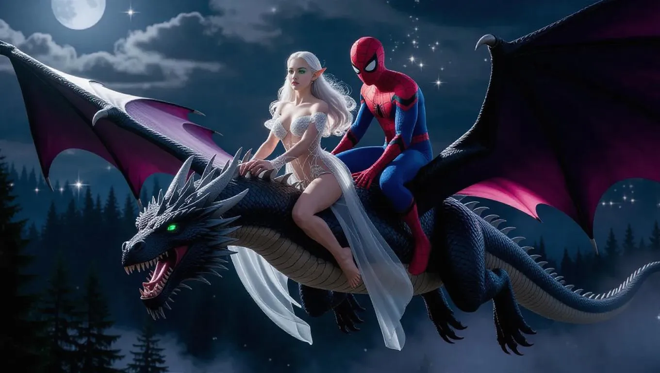 "score_9, score_8_up, score_7_up, an elven girl with long white hair, pointy ears, and glowing green eyes rides a shimmering silver dragon high above a mystical forest. Her transparent, sheer dress reveals underboob and sideboob, her glowing skin bathed in soft moonlight, accentuating her hourglass figure and large breasts. Beside her, Spider-Man clings to the back of a massive obsidian dragon, his red-and-blue suit rippling in the wind. They soar together through clouds of mist and ancient magic, surrounded by ethereal light and glittering stars. The mood is surreal, sensual, and heroic. NSFW, fantasy art, highly detailed, high contrast, film grain, 8k. Cinematic aerial wide shot, camera glides sideways through the sky."