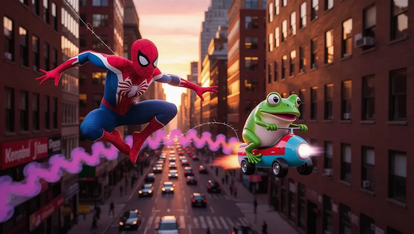“A spider-suited superhero swings between skyscrapers in a realistic New York City at sunset, chasing a bizarre cartoon frog on a tiny rocket scooter. The frog looks back mischievously as it speeds through traffic, leaving a trail of neon smoke. Cinematic golden-hour lighting, dynamic urban detail, wide-angle city view, camera tracks both characters from above in a fast-paced motion shot.” ⸻ ???? Recommended Settings for Vivago.ai: • Aspect Ratio: Horizontal (16:9) for full urban spread. • Motion Strength: High (for chase and swinging). • Style: Mixed — Realistic city + stylized creature (cartoonish frog)