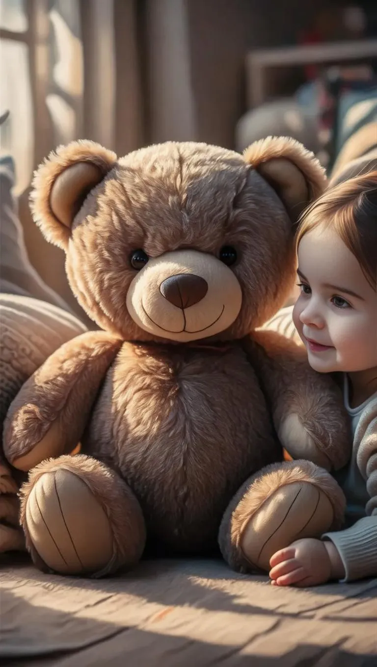 Create a heartwarming AI-generated slow-motion scene with a dark brown teddy bear symbolizing protection beside a girl. Vivago.ai crafts professional videos using soft lighting, precise close-ups, and symbolic details to evoke warmth and security. Transform text prompts into emotionally resonant visuals effortlessly.