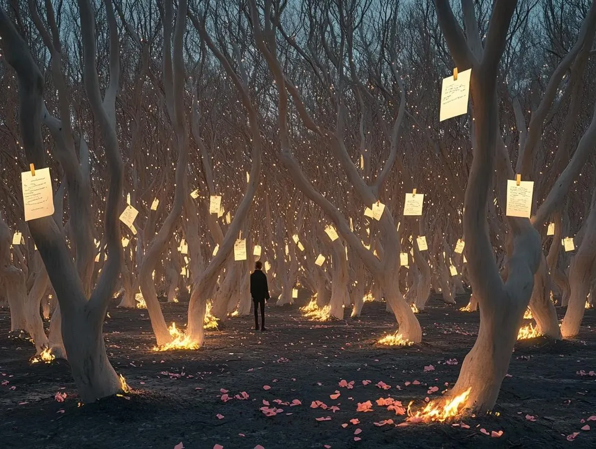 Create an AI-generated anime scene with vivago.ai: A mystical grove of glowing-tagged trees, smoldering notes, and twilight skies. Craft cinematic, watercolor visuals of a traveler amid ashes and petals using AI image tools for ethereal, magical storytelling. Ideal for anime-inspired art and atmospheric fantasy landscapes.