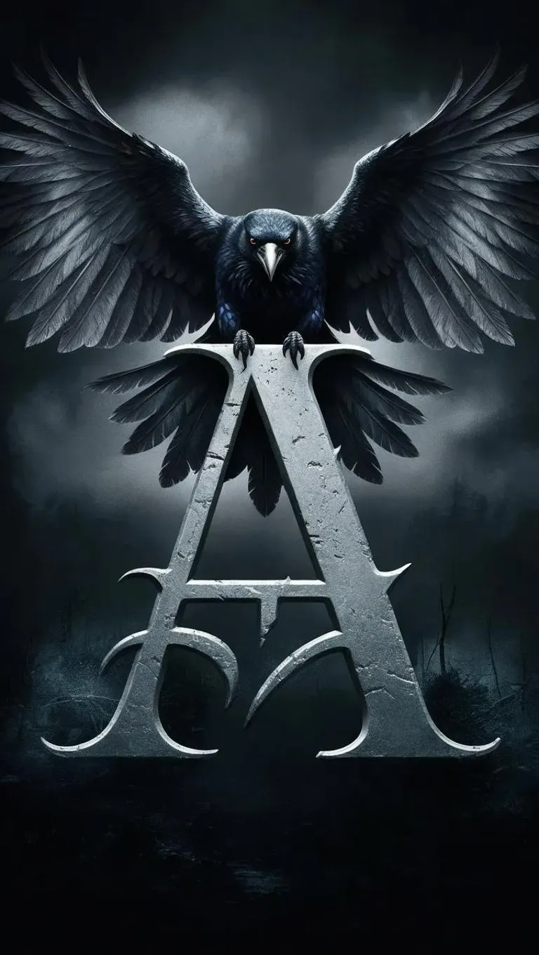 Create AI-generated art of a winged letter 'A' with a crow soaring above, set against a dark, mystical backdrop. Explore surreal typography designs and atmospheric visuals with VivaGo.ai's AI tools. Craft striking, imaginative content using text-to-image prompts and professional editing features for bold, unique creations.