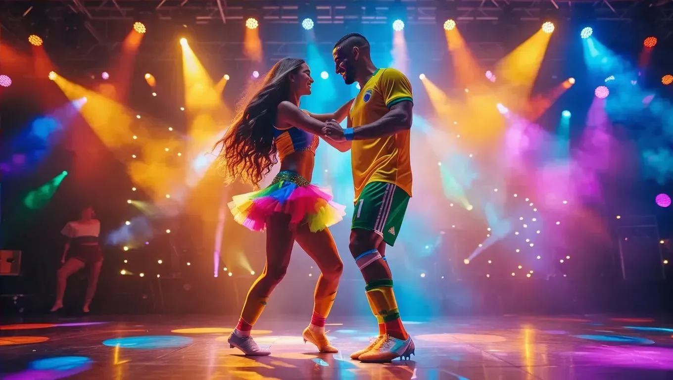Vivid AI-generated scene of a 15-foot soccer-clad girl whimsically dancing with a 5-foot samba-costumed man under carnival lights. Explore dynamic height contrasts, flowing hair, and energetic moves with Vivago.ai's creative tools for vibrant, professional-grade visuals. Perfect for crafting playful, colorful narratives blending sports energy and cultural flair through AI image generation.