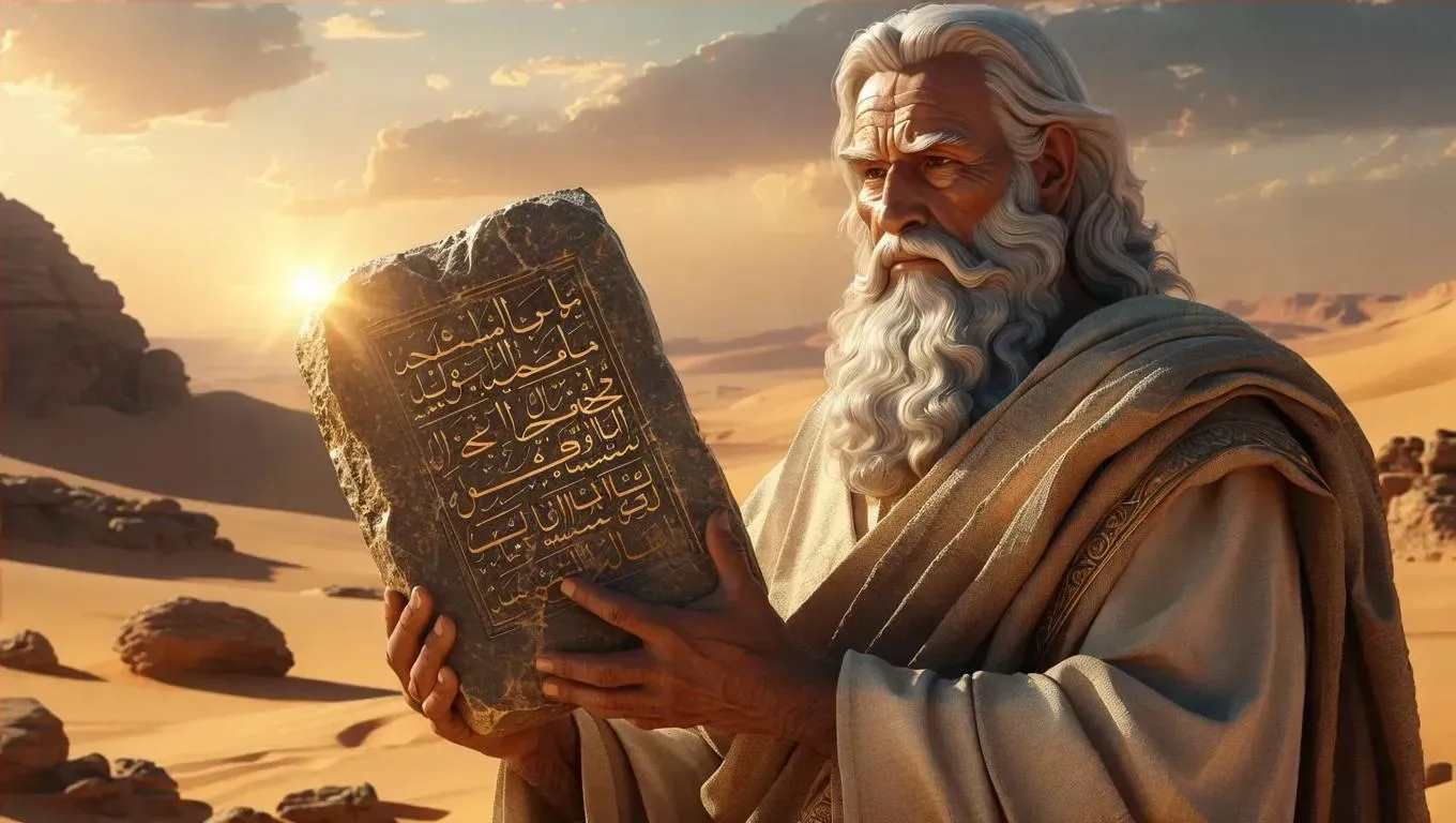 Create a majestic 4K AI-generated image of Moses holding ancient stone tablets glowing with divine light. Vivago.ai crafts lifelike biblical scenes with intricate details, desert landscapes, and ethereal carvings for professional-grade visuals. Transform prompts into realistic depictions of sacred moments using advanced AI art tools.