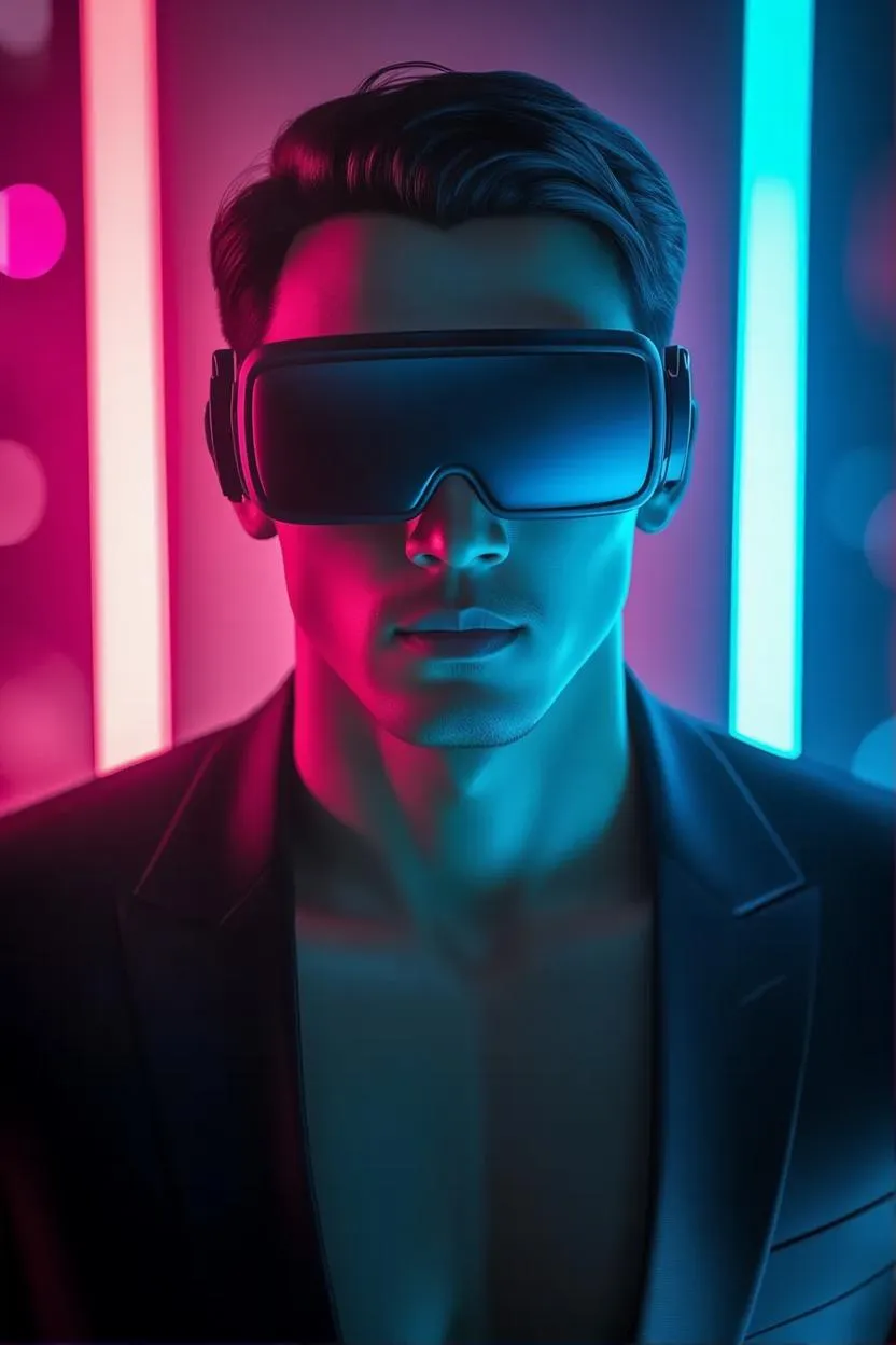 An Asian male, muscular with short clean-cut hair, wears a suit and VR glasses. The top view composition captures him in a dramatic, futuristic setting with a neon gradient background. Soft lighting enhances his smooth, delicate skin, while motion blur and multiple exposures add depth. Vibrant colors and detailed light and shadow effects create a techy, high-definition image rendered in Unreal Engine 5.