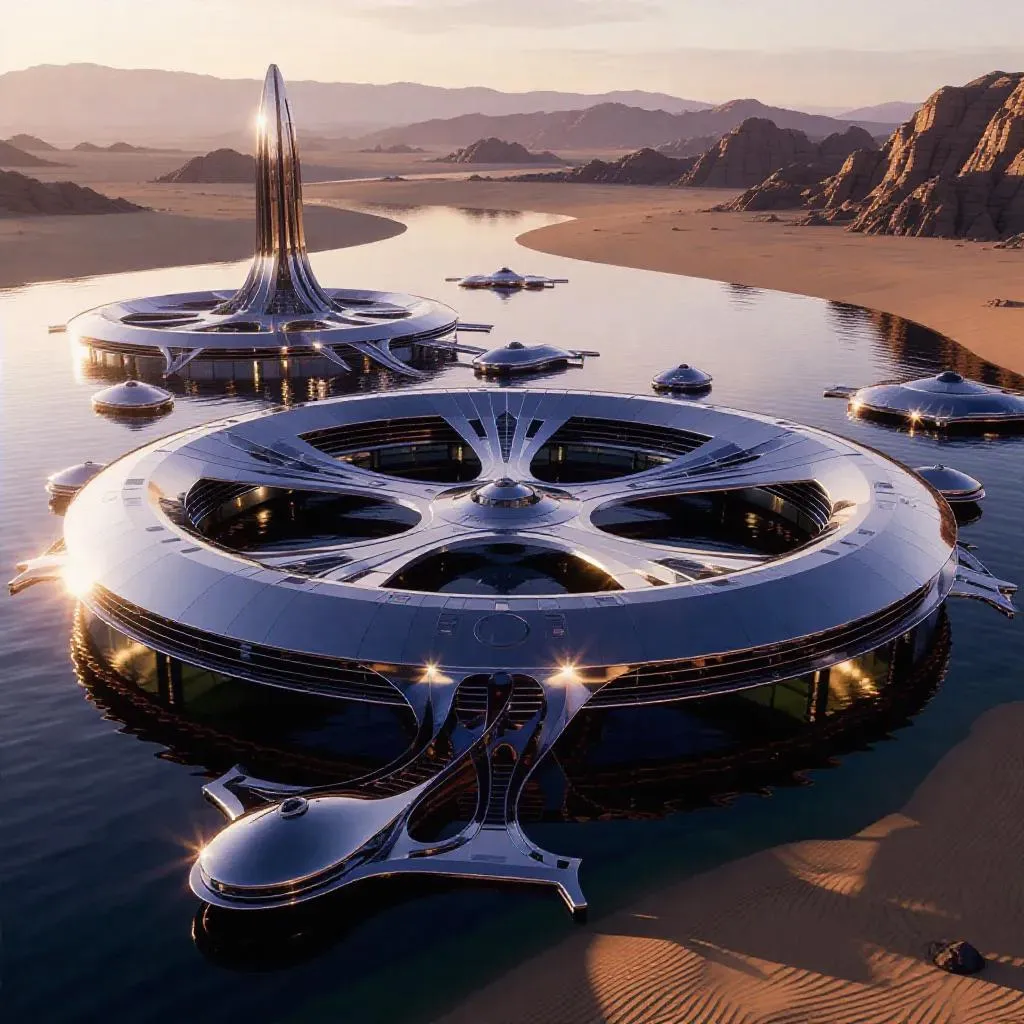 Generate awe-inspiring AI imagery of futuristic desert shoreline bases with chrome ring structures, glass complexes, and floating platforms. Explore sustainable futuristic design blending advanced technology and natural landscapes. Perfect for sci-fi concepts, architectural visualization, and harmonious innovation projects. Create visionary AI visuals effortlessly with VivaGO's cutting-edge tools.