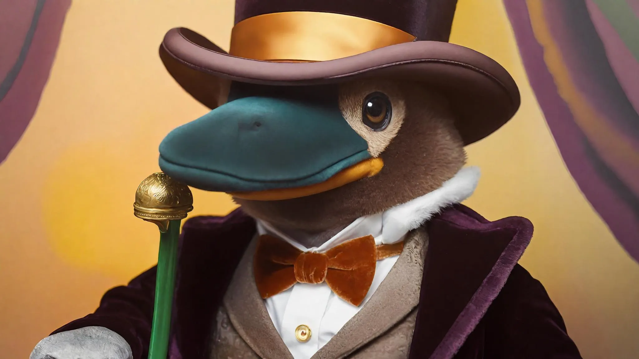 Generate a whimsical AI painting of a Victorian-era platypus stuffed animal adorned with a top hat, monocle, and cane. Explore lifelike oil painting textures and antique charm with Vivago.ai's AI art tools, blending surreal anthropomorphic characters and historical aesthetics for unique, SEO-optimized creative content.